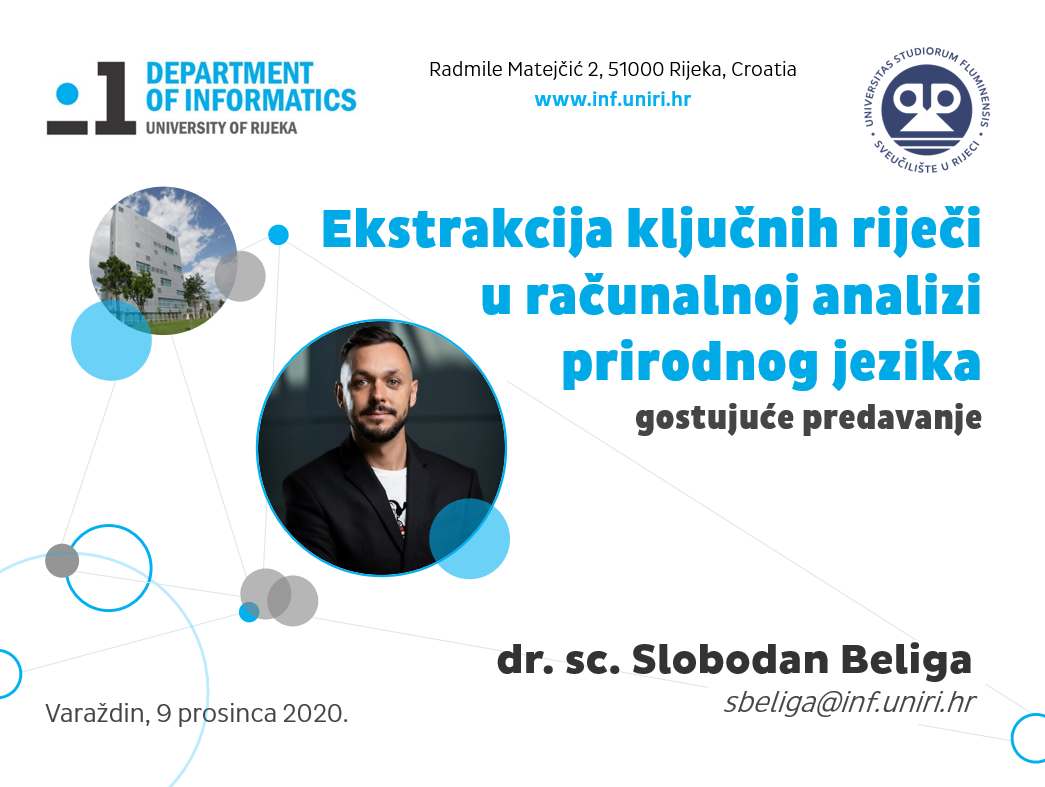 On Wednesday, December 9, 2020, starting at 10:00 am, as part of the teaching of the course Search Methods and Classification of Information, the invited lecture will be given by Dr. sc. Slobodan Beliga on the topic "Keyword extraction in computer analysis of natural language"