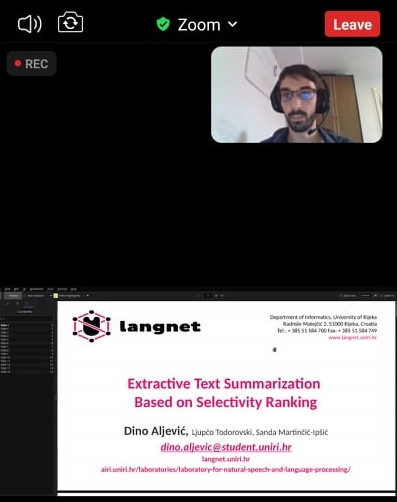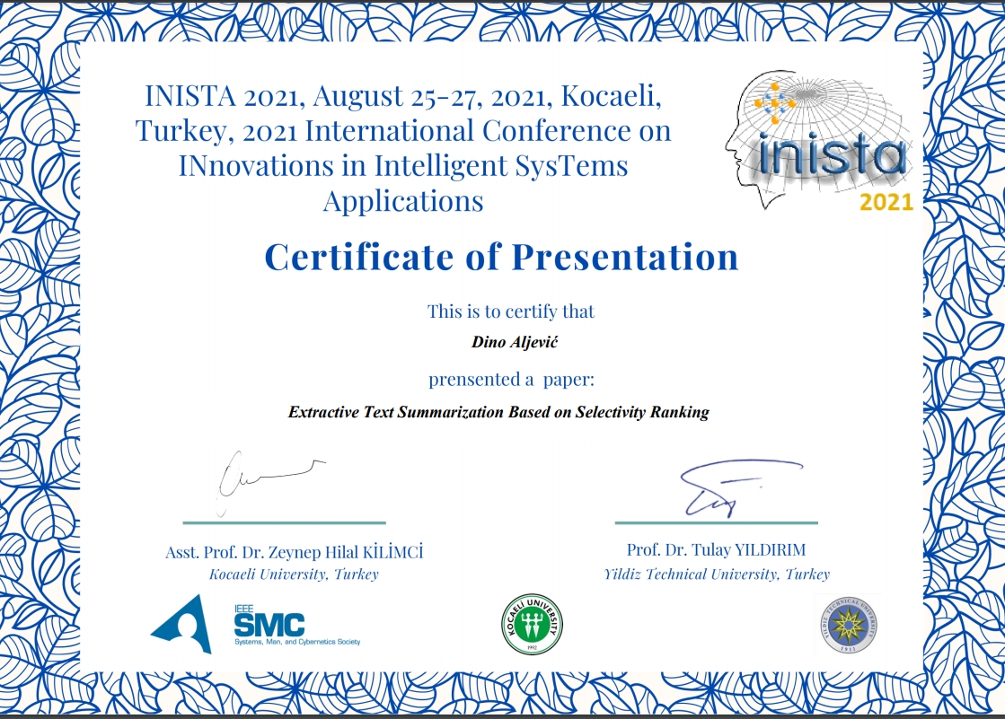 Dino Aljević presented the paper "Extractive Text Summarization Based on Selectivity Ranking" co-authored with Sanda Martinčić-Ipšić and Ljupčo Todorovski at IEEE International Conference on INnovations in Intelligent SysTems and Applications (INISTA'21) , 27.8.2021.