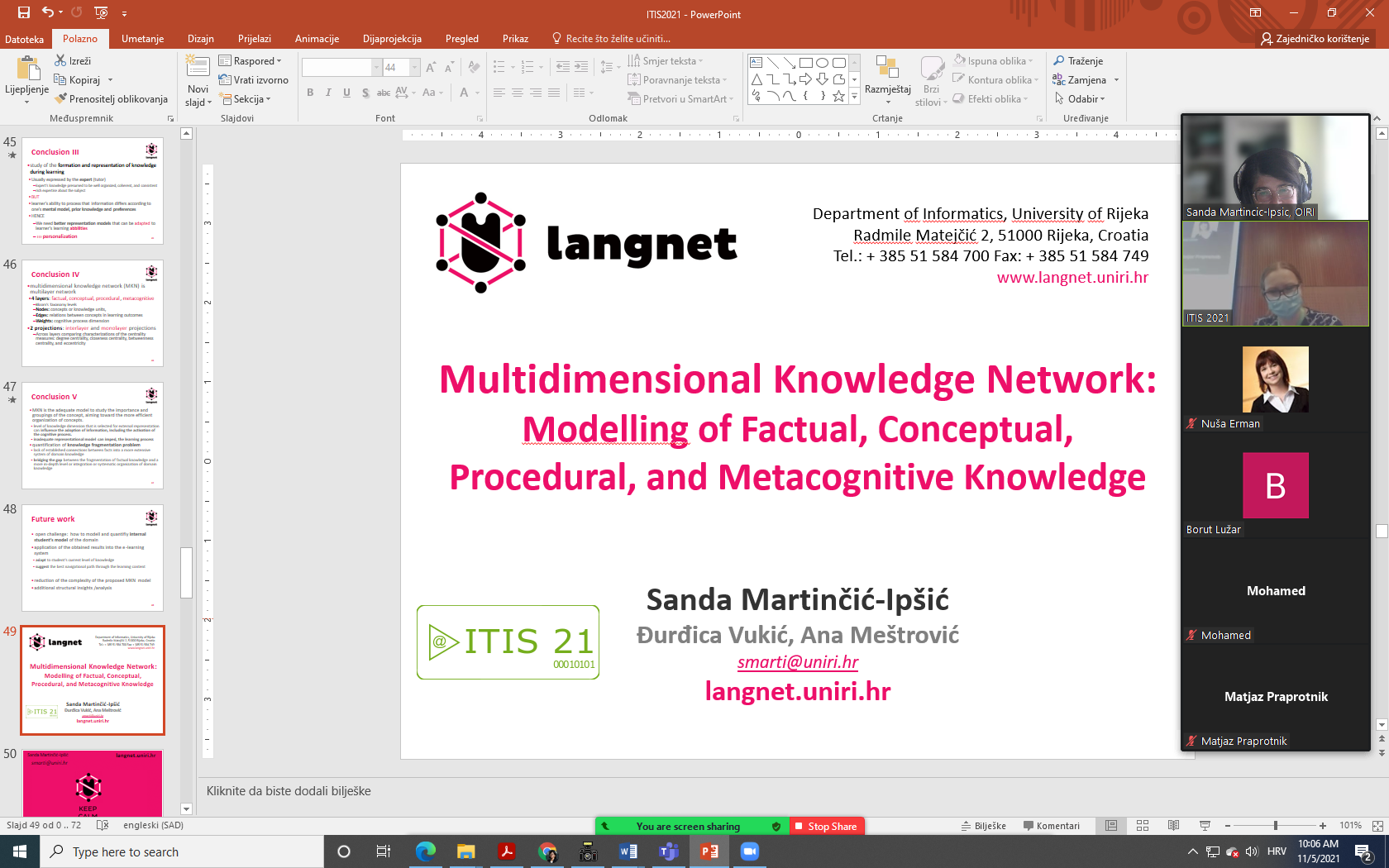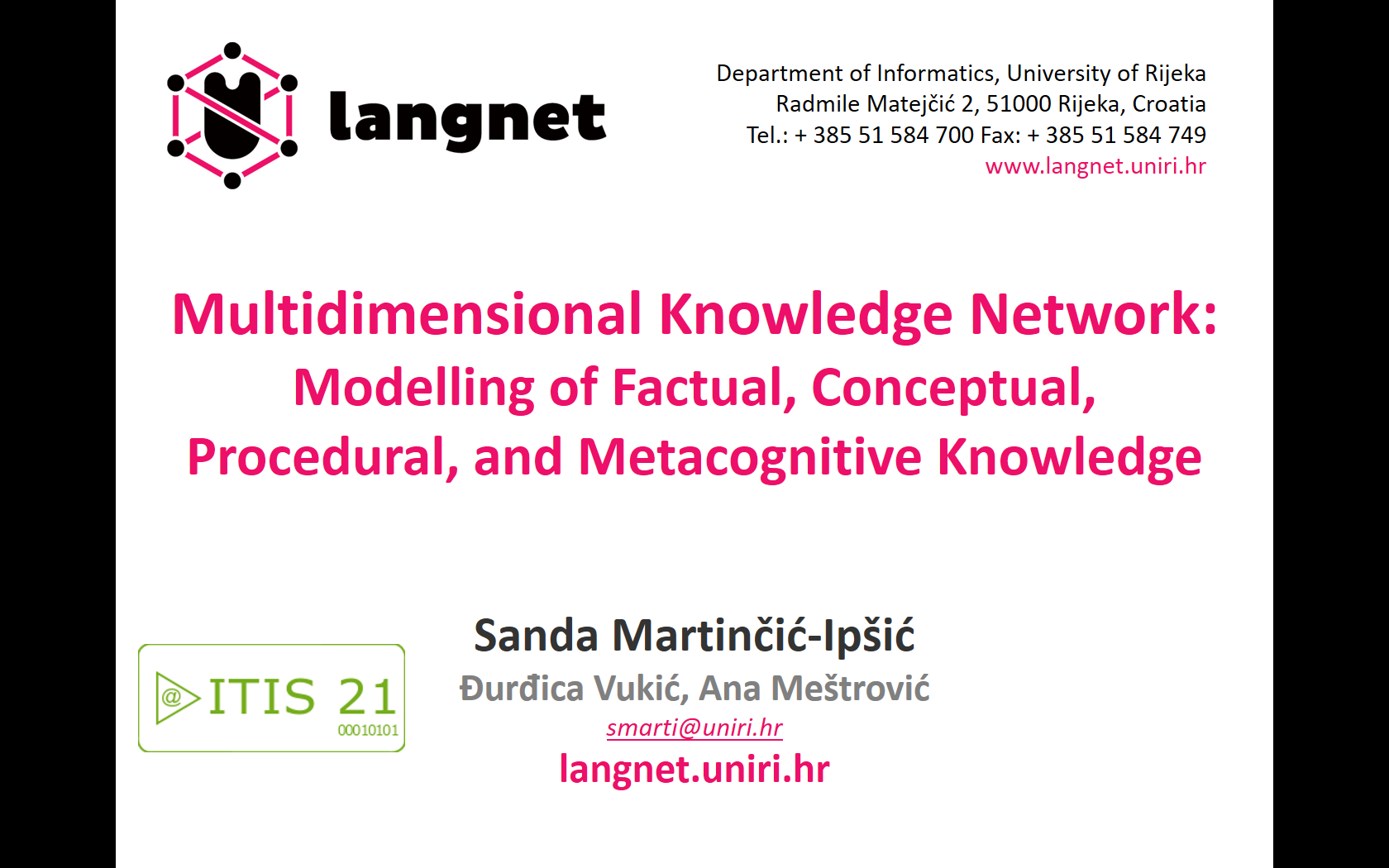 Sanda Martinčić Ipšić gave the invited talk "Multidimensional Knowledge Network: Modelling of Factual, Conceptual, Procedural, and Metacognitive Knowledge" at 12th International Conference on Information Technologies and Information Society, 5.11.2021. ITIS2021