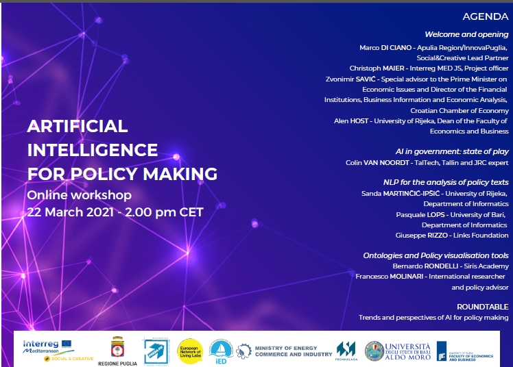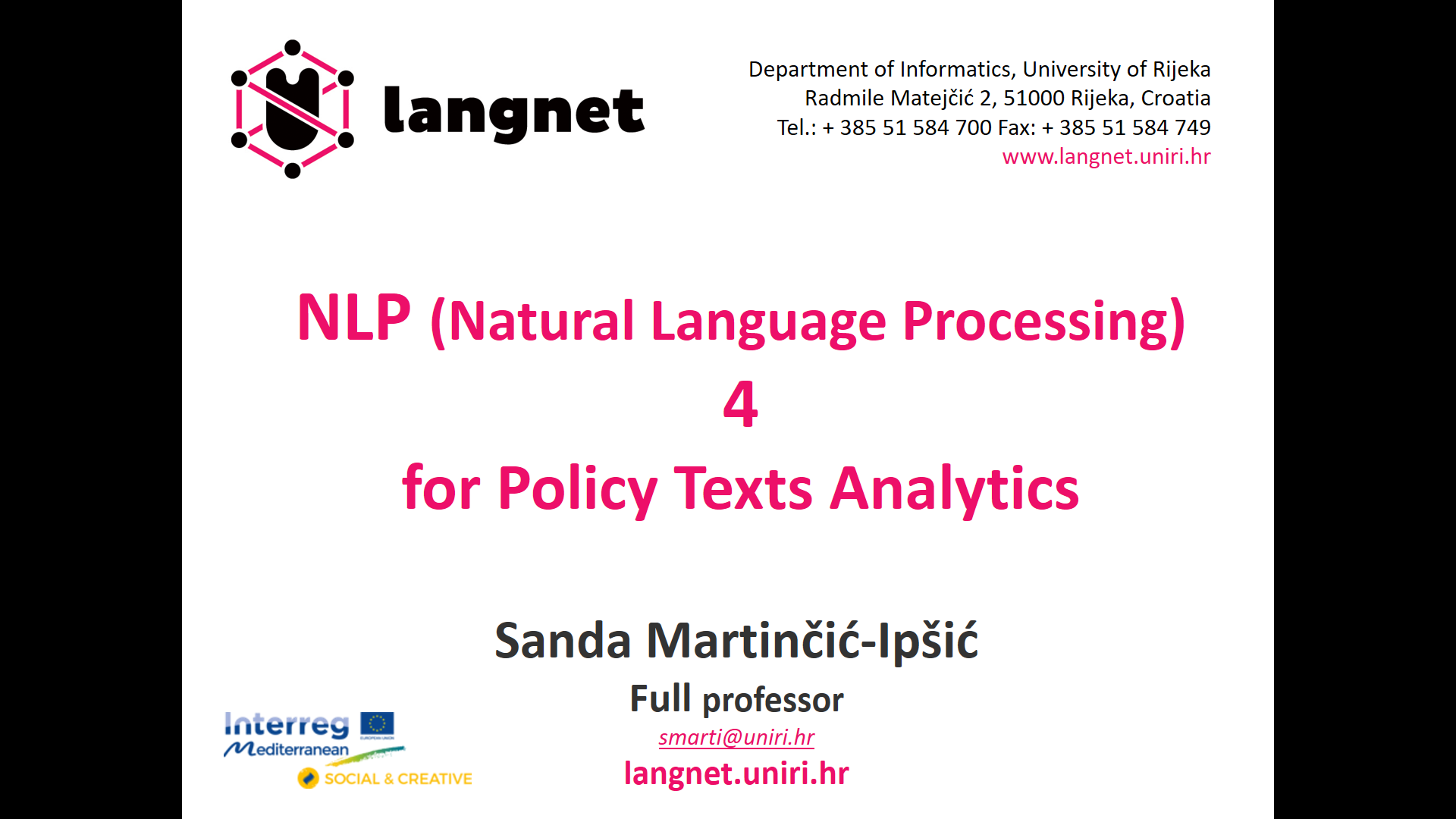 Sanda Martinčić-Ipšić gave an invited talk „Natural Language Processing 4 for Policy Texts Analytics“ at “Artificial Intelligence for Policy Making” workshop at Social & Creative project funded by the Interreg MED programme. Workshop on exploring trends of Artificial Intelligence at the service of policy making was held online on 22nd of March 2021. Link Social & Creative project