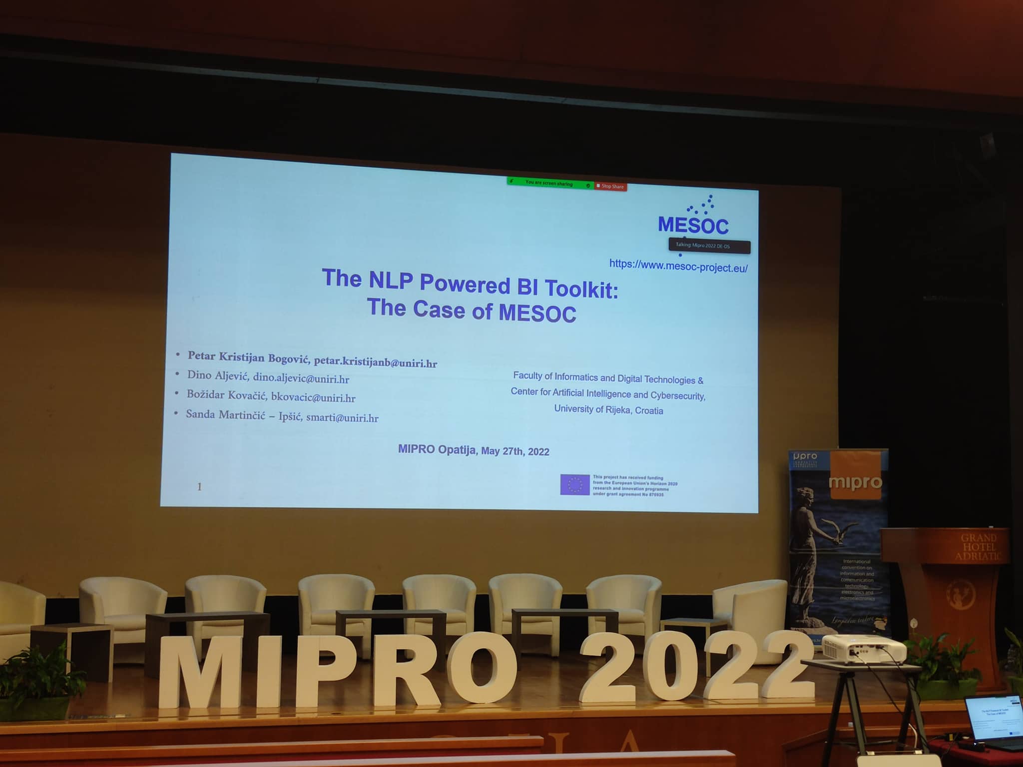 Petar Kristijan Bogović presented the paper "The NLP Powered BI Toolkit: The Case of MESOC" co-authored with Dino Aljević, Božidar Kovačić and Sanda Martinčić-Ipšić IEEE MIPRO 2022 Conference in DE-DS Section (MIPRO-DE-DS 2022) , 27.05.2022.
