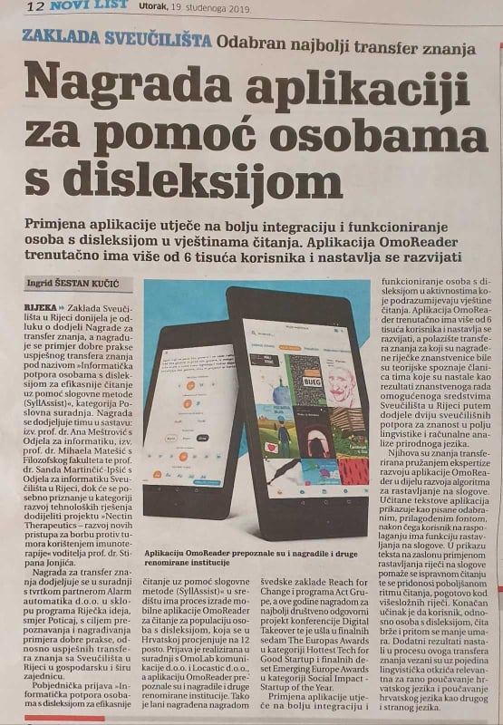 OmoReader is a free mobile application that helps people with dyslexia to read text comfortably. The author of the idea is Petar Reić from OmoLab and Locastic companies developed the app. The algorithm used in the process of separating the word into the syllables is the result of the original scientific work "Syllabification based on maximal onset principle for Croatian", published in the Speech journal. The authors of the paper are Prof. Ana Meštrović, Prof. Sanda Martinčić-Ipšić from the Department of Informatics and Asist. Prof. Mihaela Matešić from the Faculty of Philosophy in Rijeka.